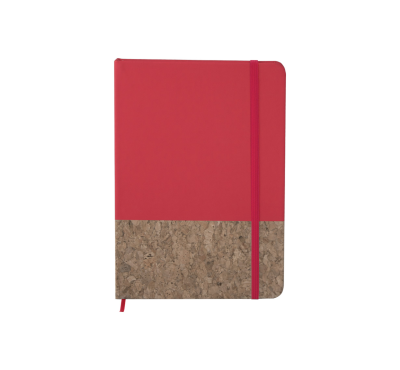 A5 Notebook with natural cork hardcover and soft-feel PU top part, includes 80 sheets of ivory-colored lined paper, a matching coloured elastic closure, and bookmark.