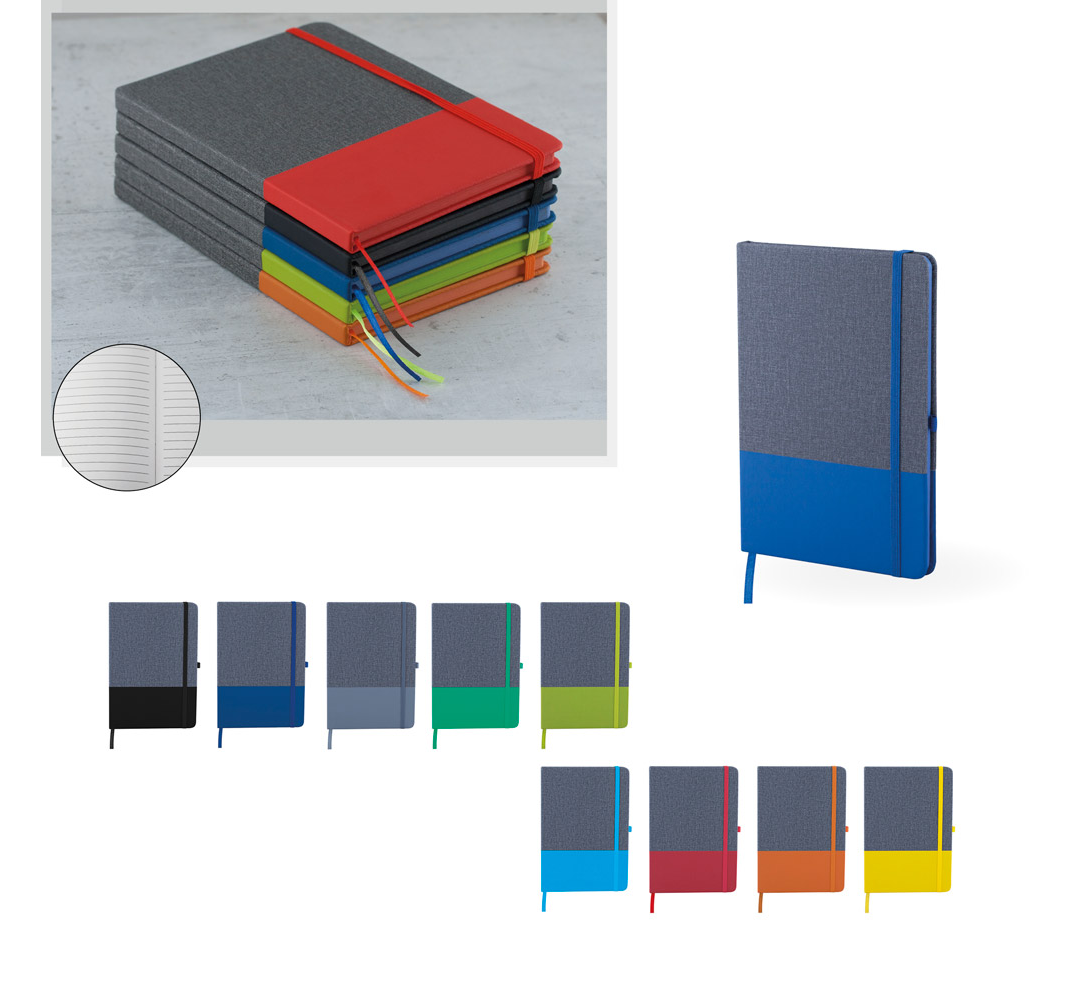 Тефтер A5 с ластик и разделител, 80 листа с редове, цвят на хартията слонова кост с цветен ръб, твърда корица.