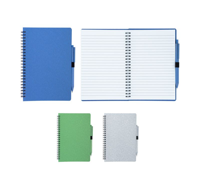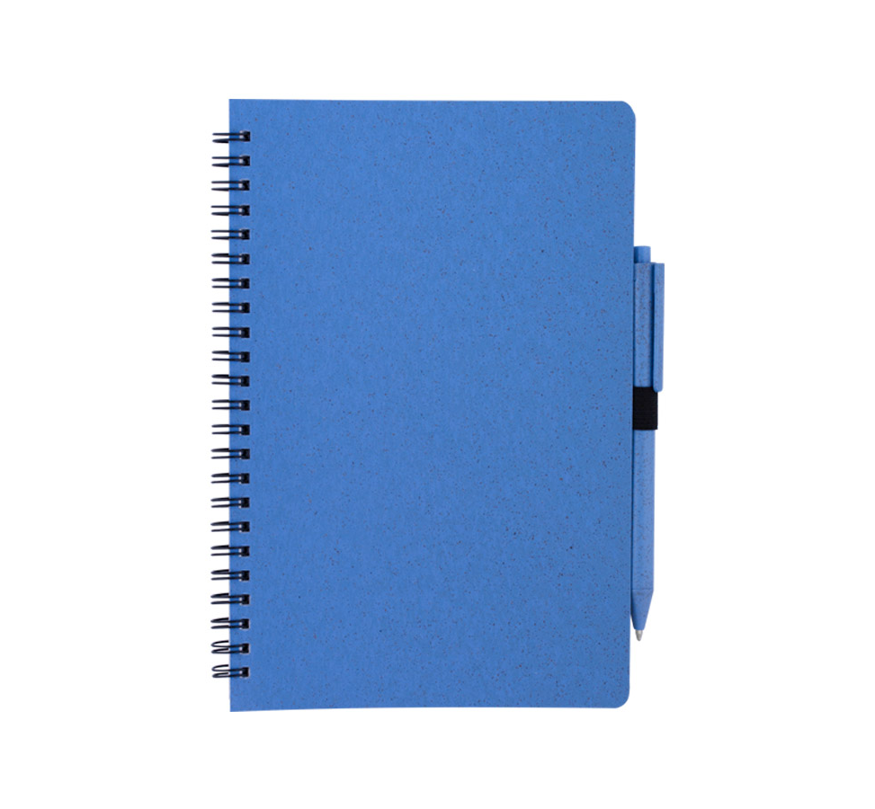 A5 wheat straw Notebook with flexible cover, includes 70 sheets of white-colored lined paper and wheat straw ballpoint pen, blue ink.