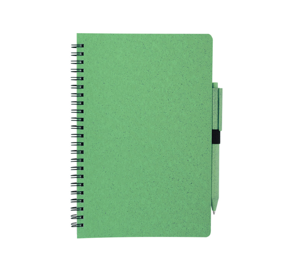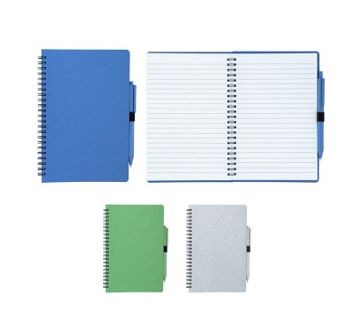 A5 wheat straw Notebook with flexible cover, includes 70 sheets of white-colored lined paper and wheat straw ballpoint pen, blue ink.