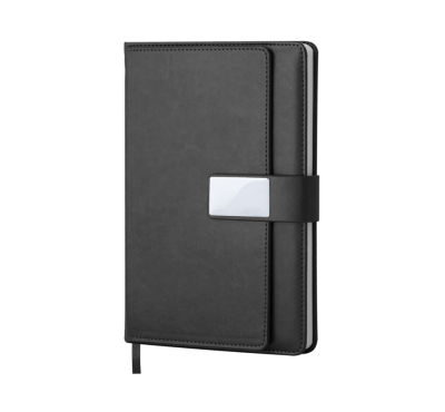 A5 Notebook with soft-feel PU cover with magnet closure, includes 112 sheets of white-colored lined paper, inner document compartments and business card slot and a matching coloured ribbon.