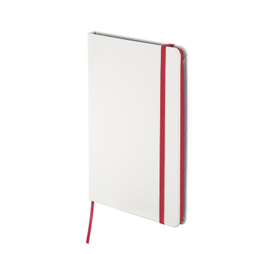 A5 Notebook with soft-feel PU cover, includes 80 sheets of ivory-colored lined paper, a matching coloured elastic closure and ribbon.