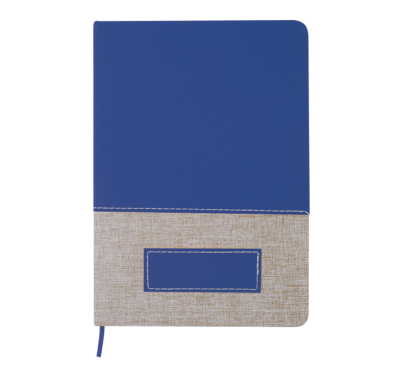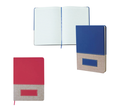 A5 Notebook with fabric cover and leather-look side, includes 80 sheets of ivory-colored lined paper, a matching coloured ribbon.