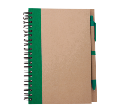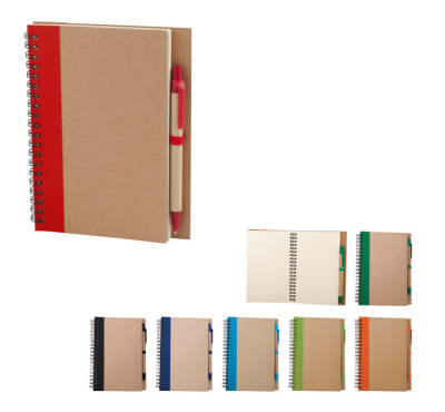 Recycled paper hardcover spiral notebook, includes 70 sheets of ivory-colored paper and a recycled paper ballpoint pen, blue ink.