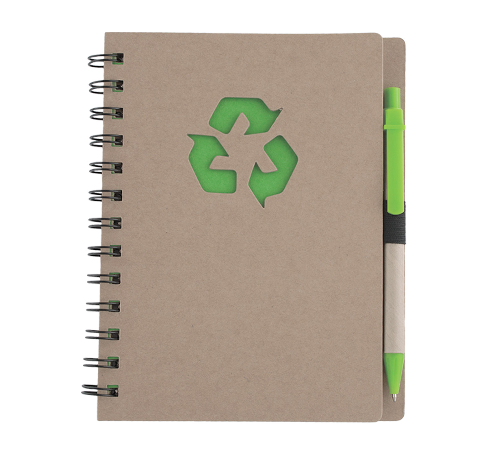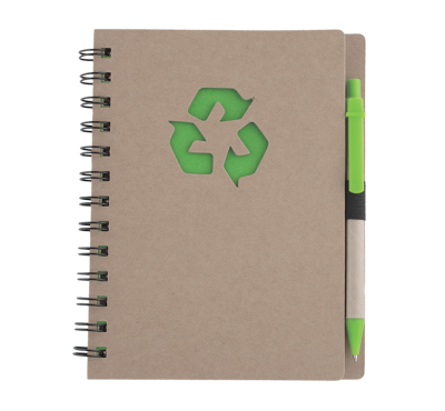 Recycled paper hardcover spiral notebook, includes 70 sheets of natural-colored lined paper and a recycled paper ballpoint pen, blue ink.