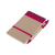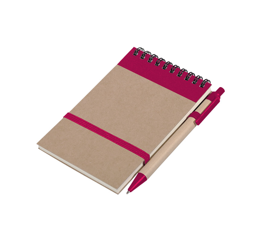 Pocket size recycled paper hardcover spiral notebook, includes 70 sheets of natural-colored lined paper, a matching coloured elastic closure, and a recycled paper ballpoint pen, blue ink.