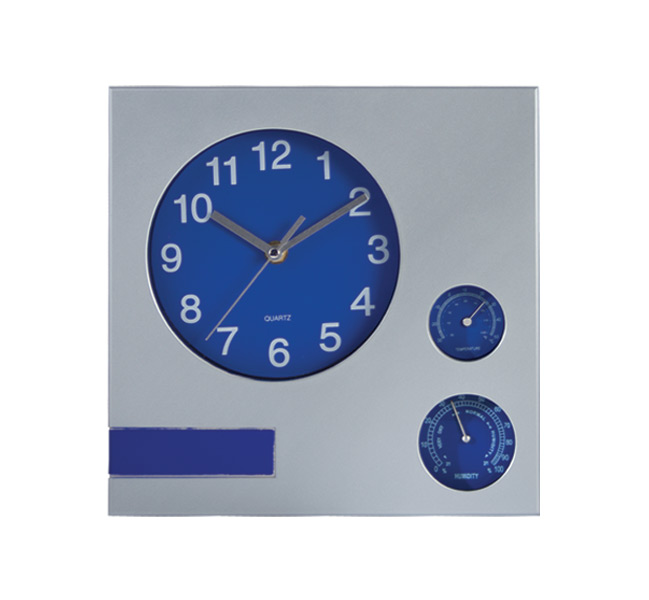 Square wall clock with tic-toc system and a frame crafted from plastic. Functions: thermometer and hygrometer.