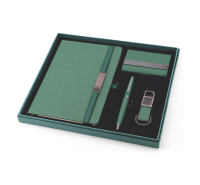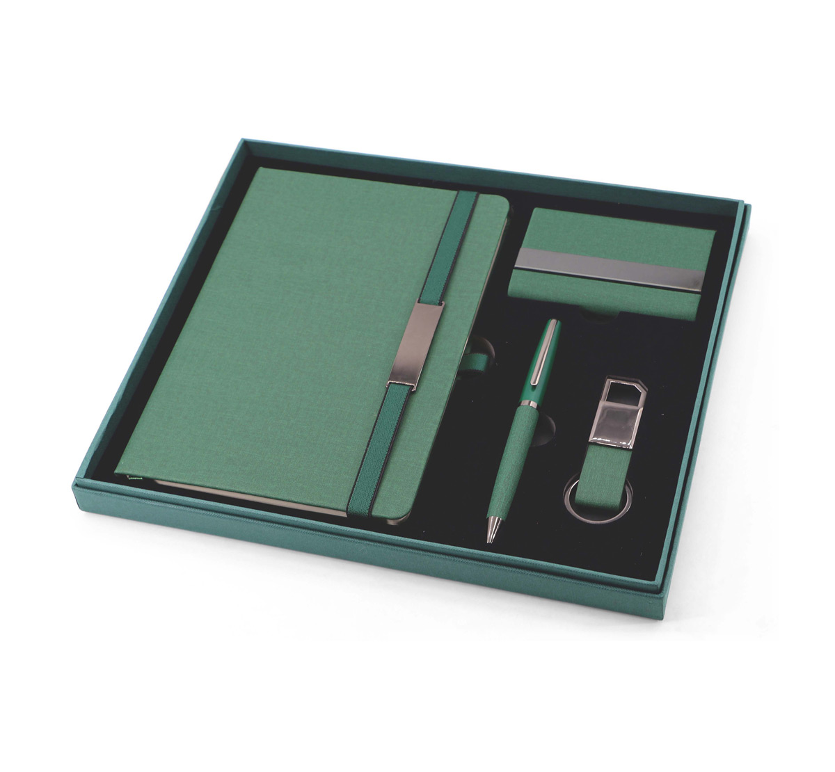Комплект тефтер, химикалка, ключодържател и визитник в кутия.