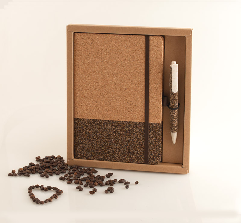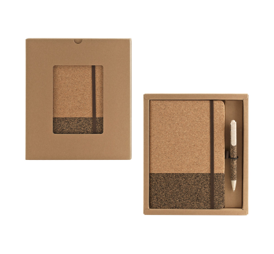 Тефтер A5 с ластик и еко химикалка в кутия, 96 листа с редове, цвят на хартията слонова кост, твърда корица.