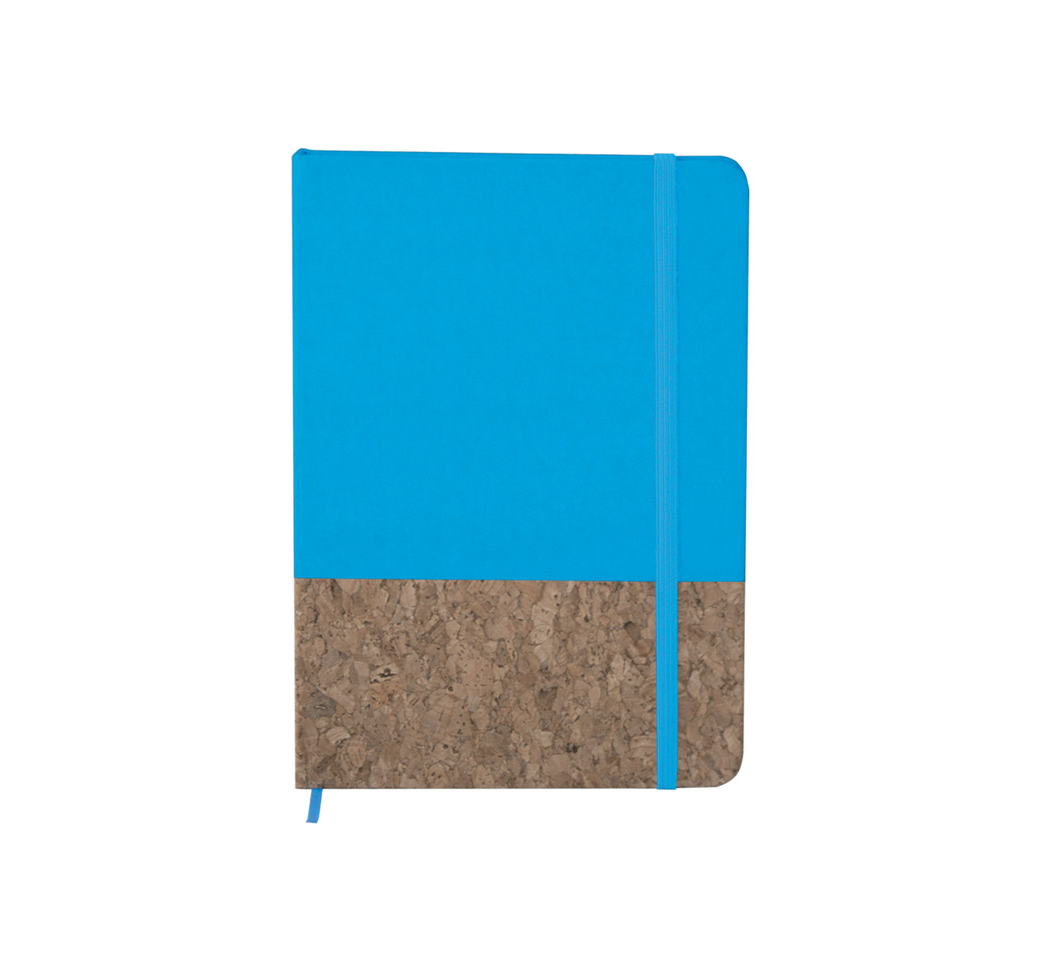 A5 Notebook with natural cork hardcover and soft-feel PU top part, includes 80 sheets of ivory-colored lined paper, a matching coloured elastic closure, and bookmark.