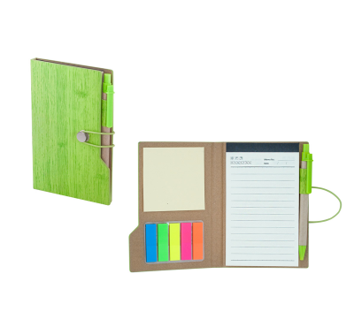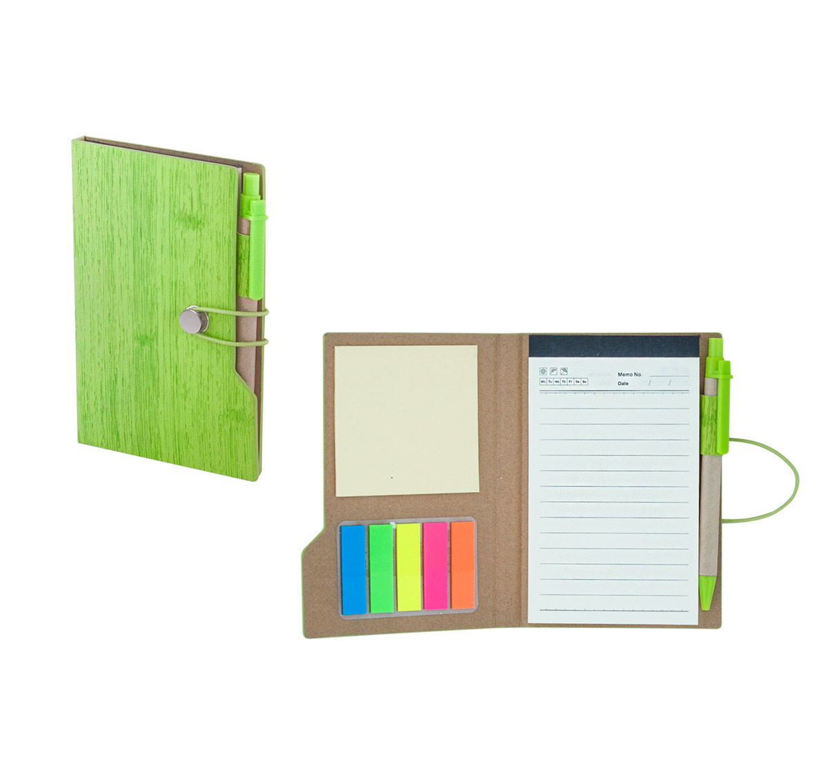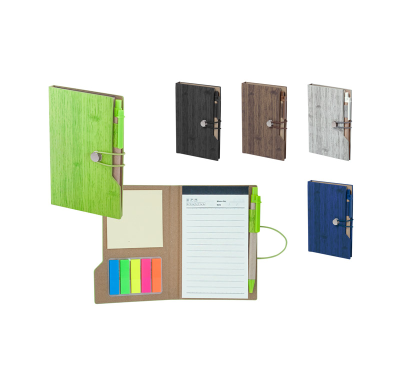 A6 notebook with hard cover, includes 70 sheets of ivory-colored lined paper, sticky notes and eco pen.
