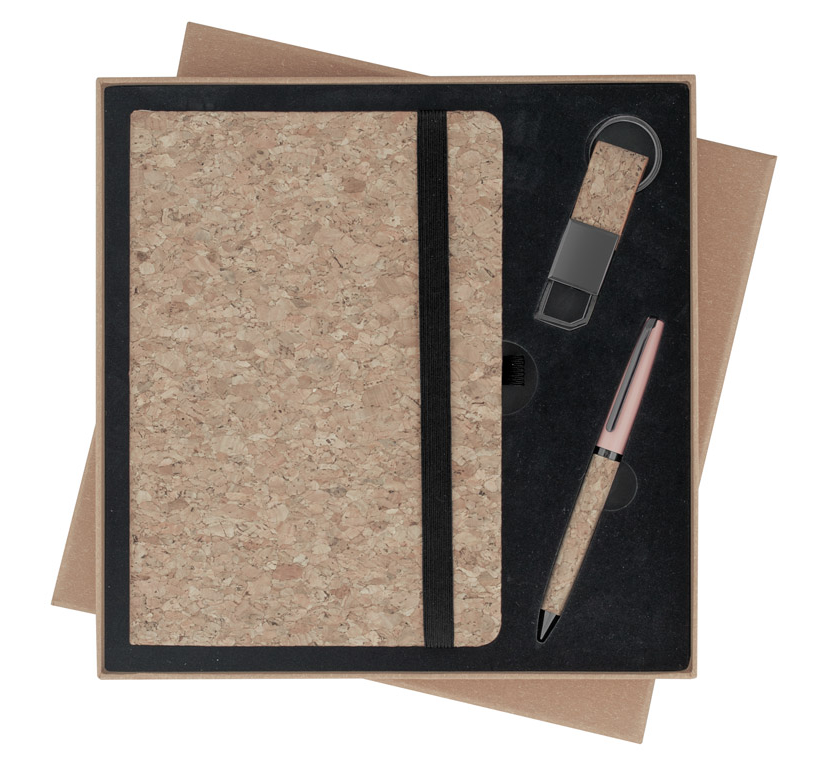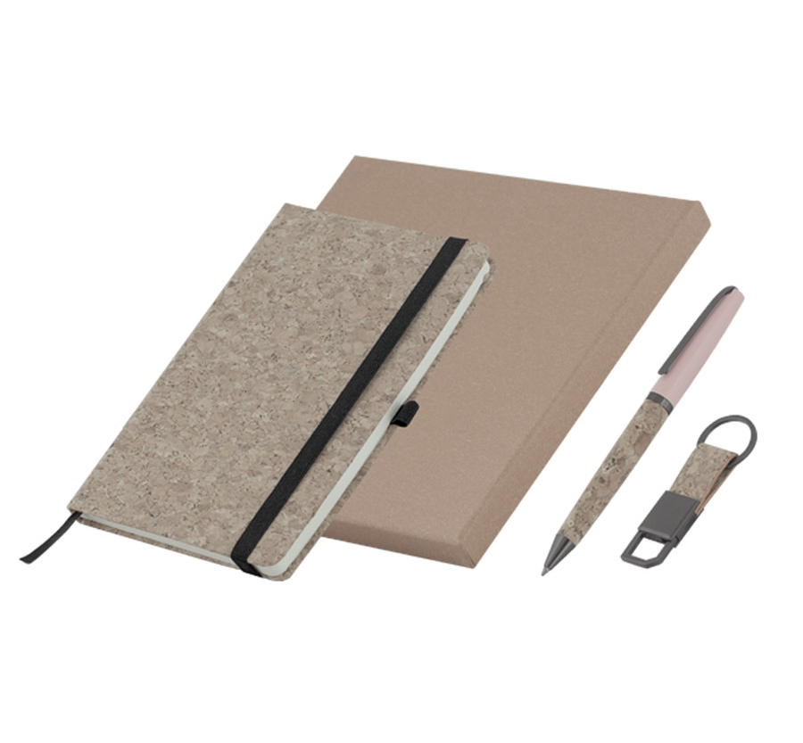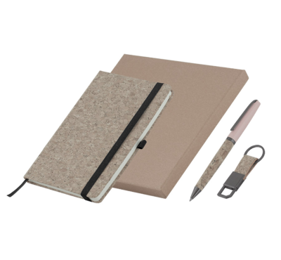 Notebook material: cork and paper. 96 lined pages, paper color ivory, hardcover.