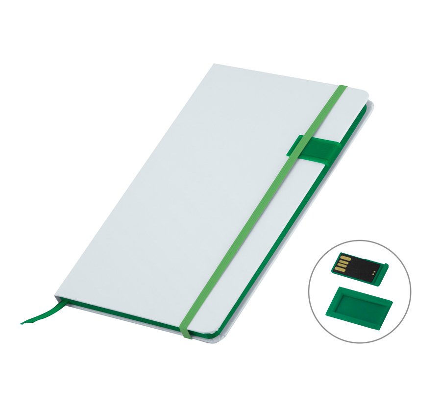 A5 notebook with built-in USB 64GB, rubber band, divider, 80 lined sheets, paper color ivory with colored border, hardcover.