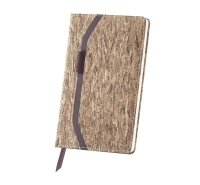 A5 Notebook with natural cork hardcover and thermo PU, includes 96 sheets of ivory-colored lined paper, matching bookmark and pen loop.