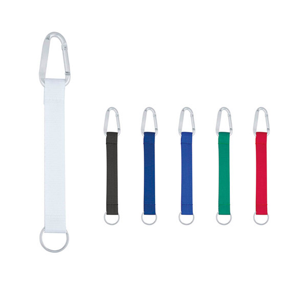 Aluminium carabiner keychain with color polyester webbing, and metal split keyring.