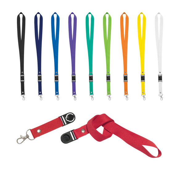 Polyester lanyard with metal hook and safety breakaway.