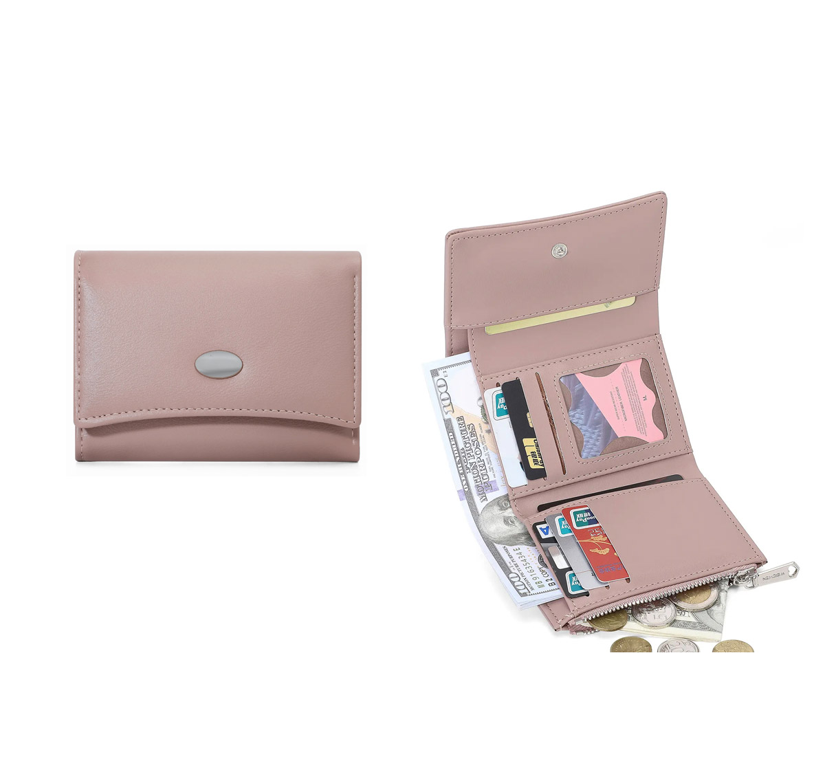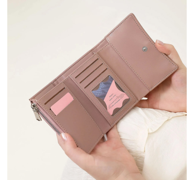 Дамско портмоне с едно отделение за банкноти, отделение за монети с цип, вътрешни джобове за карти.