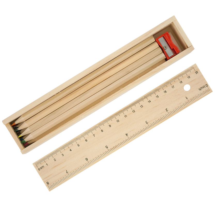 Кутия с 12 цветни моливи, гума, острилка и линия.