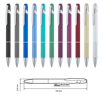 Metal ballpoint pen, slim plastic refill, blue ink.