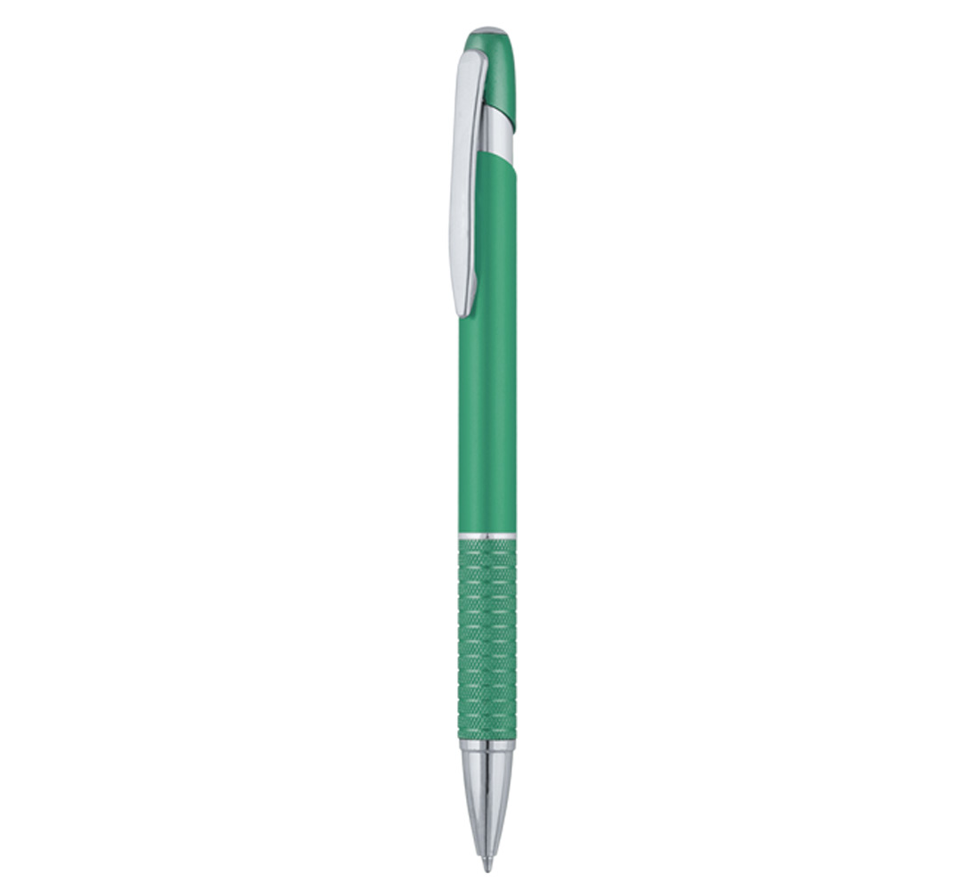 Metal ballpoint pen, slim plastic refill, blue ink.