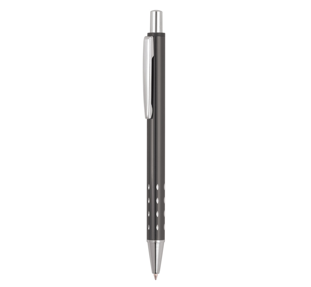 Metal ballpoint pen, slim plastic refill, blue ink.