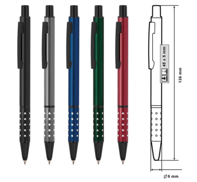 Размер на артикула: Ø9х136 mm. Печатаемо поле: 45х5 mm. Печат: тампонен, ситопечат, гравиране.