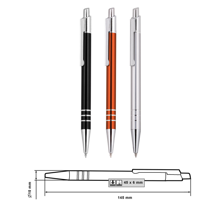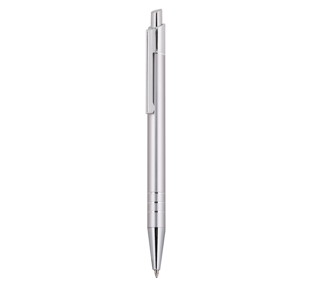 Metal ballpoint pen, slim plastic refill, blue ink.