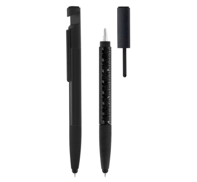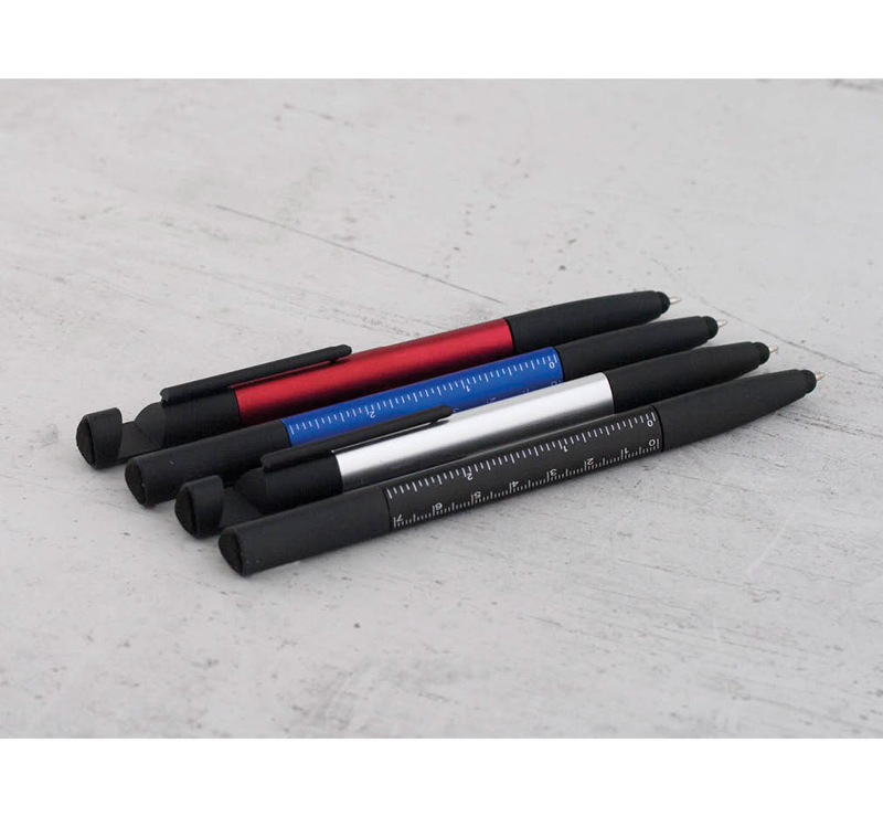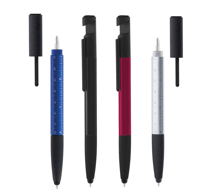 Multifunction stylus pen with phone stand, ruler, and screen cleaning tool.