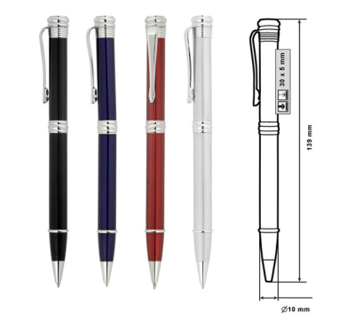 Размер на артикула: Ø10х139 mm. Печатаемо поле: 30х5 mm. Печат: тампонен, ситопечат, гравиране.