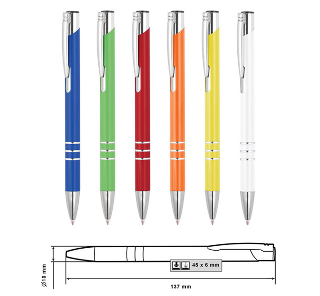 Metal ballpoint pen, slim plastic refill, blue ink.