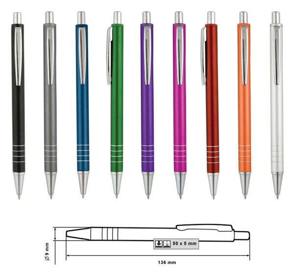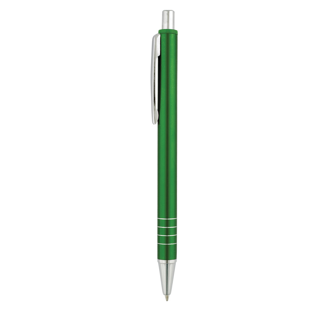 Metal ballpoint pen, slim plastic refill, blue ink.