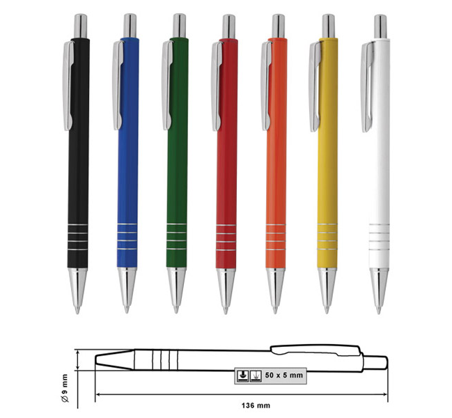 Размер на артикула: Ø9х136 mm. Печатаемо поле: 50х5 mm. Печат: тампонен, ситопечат, гравиране.
