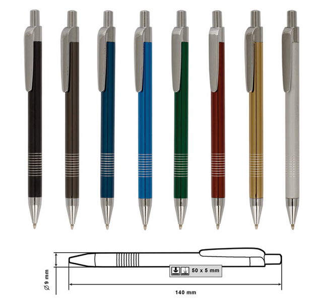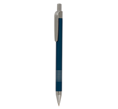 Metal ballpoint pen, slim plastic refil, blue ink.