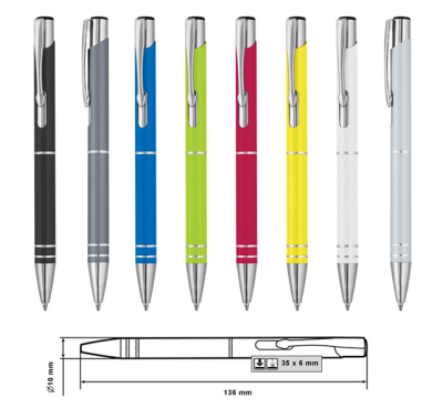 Размер на артикула: Ø10х136 mm. Печатаемо поле: 35х6 mm. Печат: тампонен, ситопечат, гравиране.