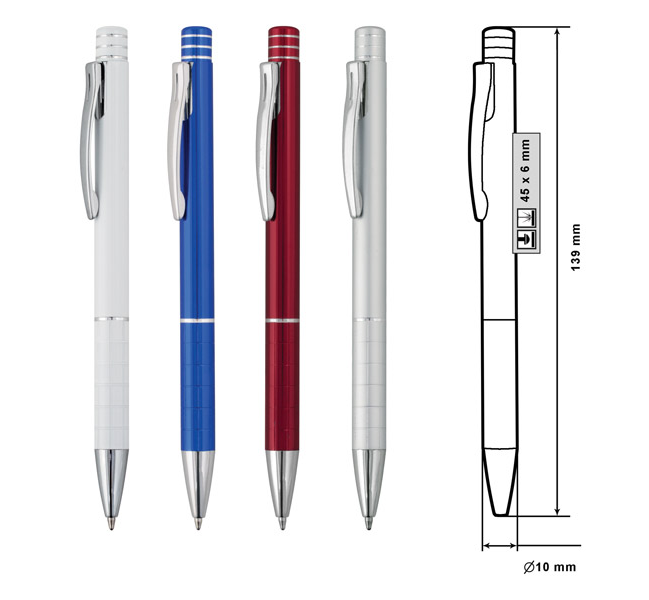 Metal ballpoint pen, slim plastic refill, blue ink.