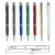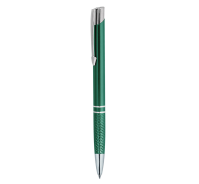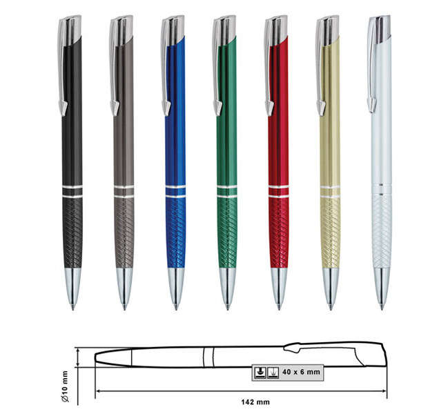 Metal ballpoint pen, slim plastic refill, blue ink.