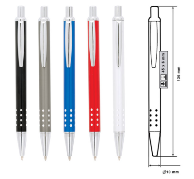 Размер на артикула: Ø10х136 mm. Печатаемо поле: 45х6 mm. Печат: тампонен, ситопечат, гравиране.