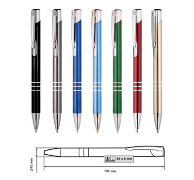 Metal ballpoint pen, slim plastic refill, blue ink.
