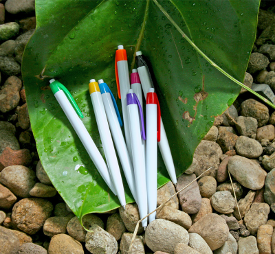 Plastic ballpoint pen, slim plastic refill, blue ink.