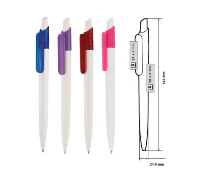 Plastic ballpoint pen, slim plastic refill, blue ink.