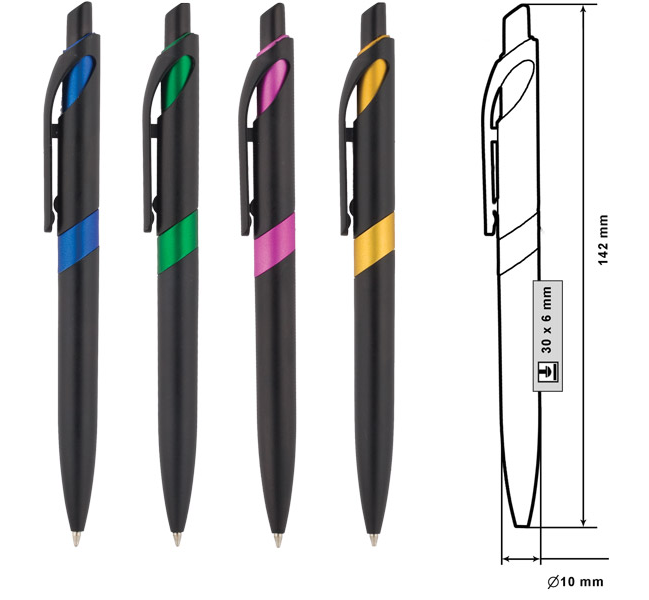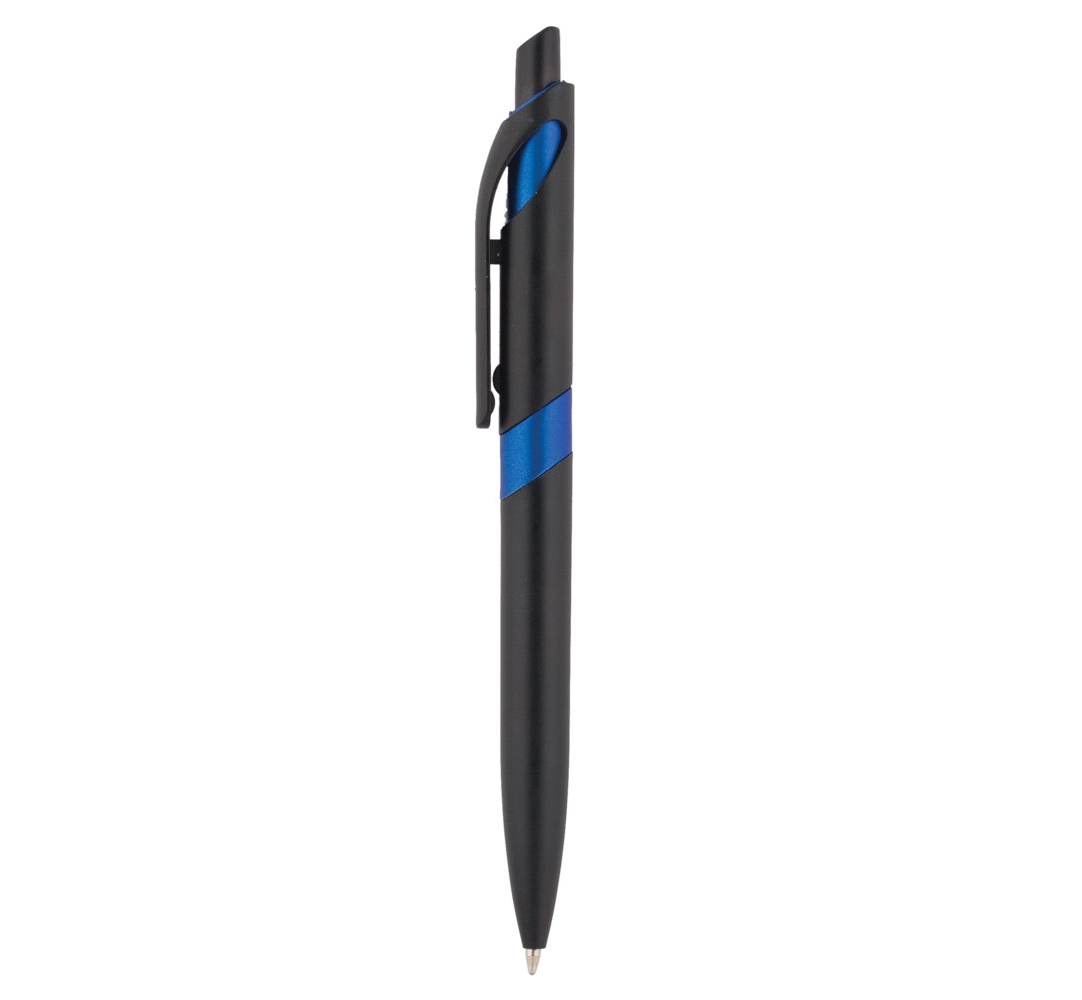 Plastic ballpoint pen, slim plastic refill, blue ink.