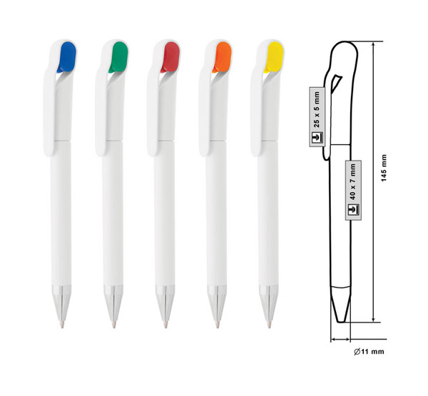 Размер на артикула: Ø11х145 mm. Печатаемо поле: 40х7 mm. Печатаемо поле клипс: 25х5 mm. Печат: тампонен, ситопечат.