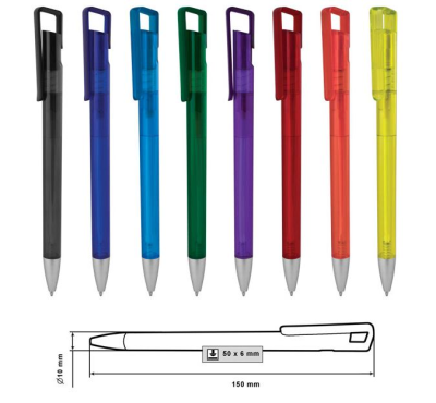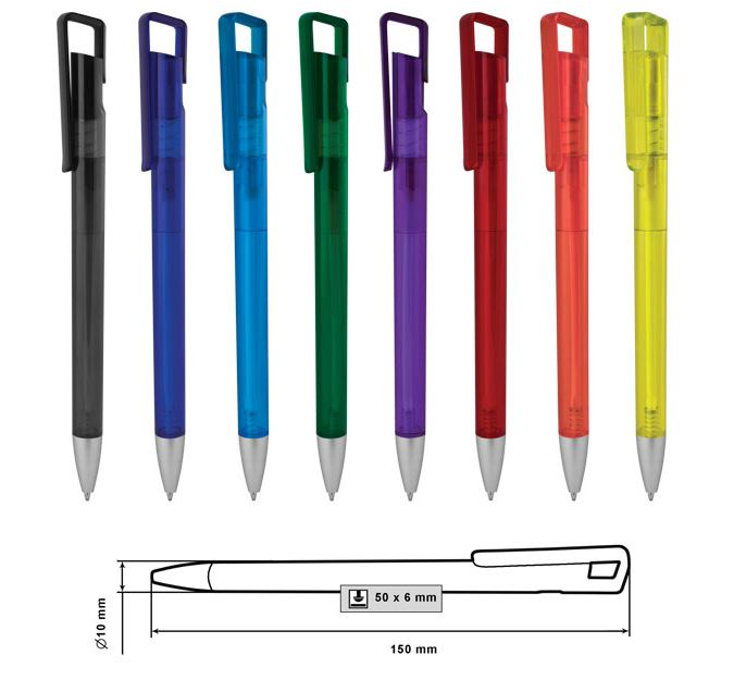 Plastic ballpoint pen, slim plastic refill, blue ink.