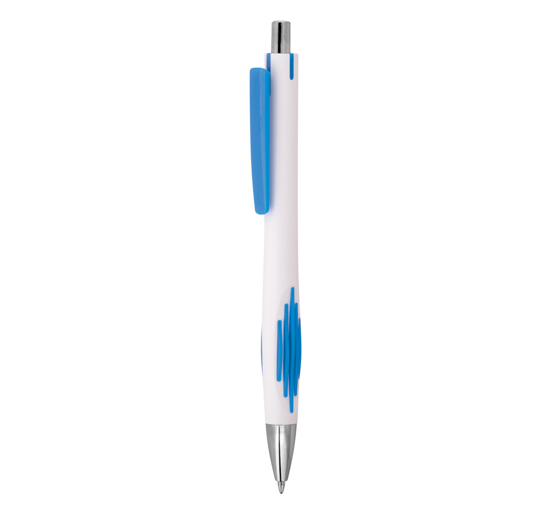 Plastic ballpoint pen, slim plastic refill, blue ink.