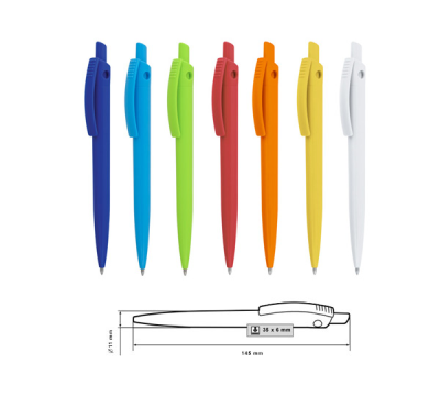 Plastic ballpoint pen, slim plastic refill, blue ink.