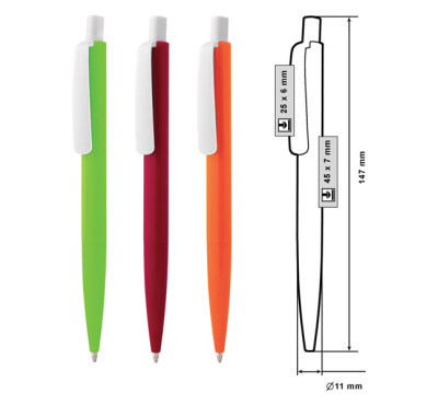 Размер на артикула: Ø11х147 mm. Печатаемо поле: 45х7 mm. Печатаемо поле клипс: 25х6 mm. Печат: тампонен, ситопечат.
