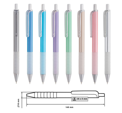 Plastic ballpoint pen, slim plastic gel refill, blue ink.