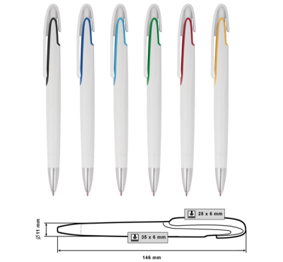 Размер на артикула: Ø11х146 mm. Печатаемо поле: 35х6 mm. Печатаемо поле клипс: 25х6 mm. Печат: тампонен, ситопечат.