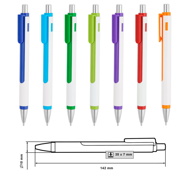Plastic ballpoint pen, slim plastic refill, blue ink.