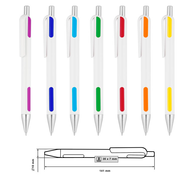Plastic ballpoint pen, slim plastic refill, blue ink.